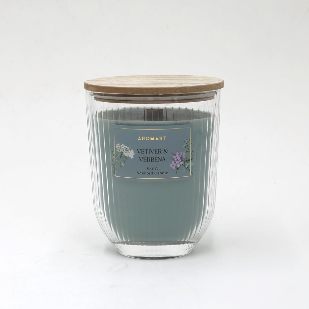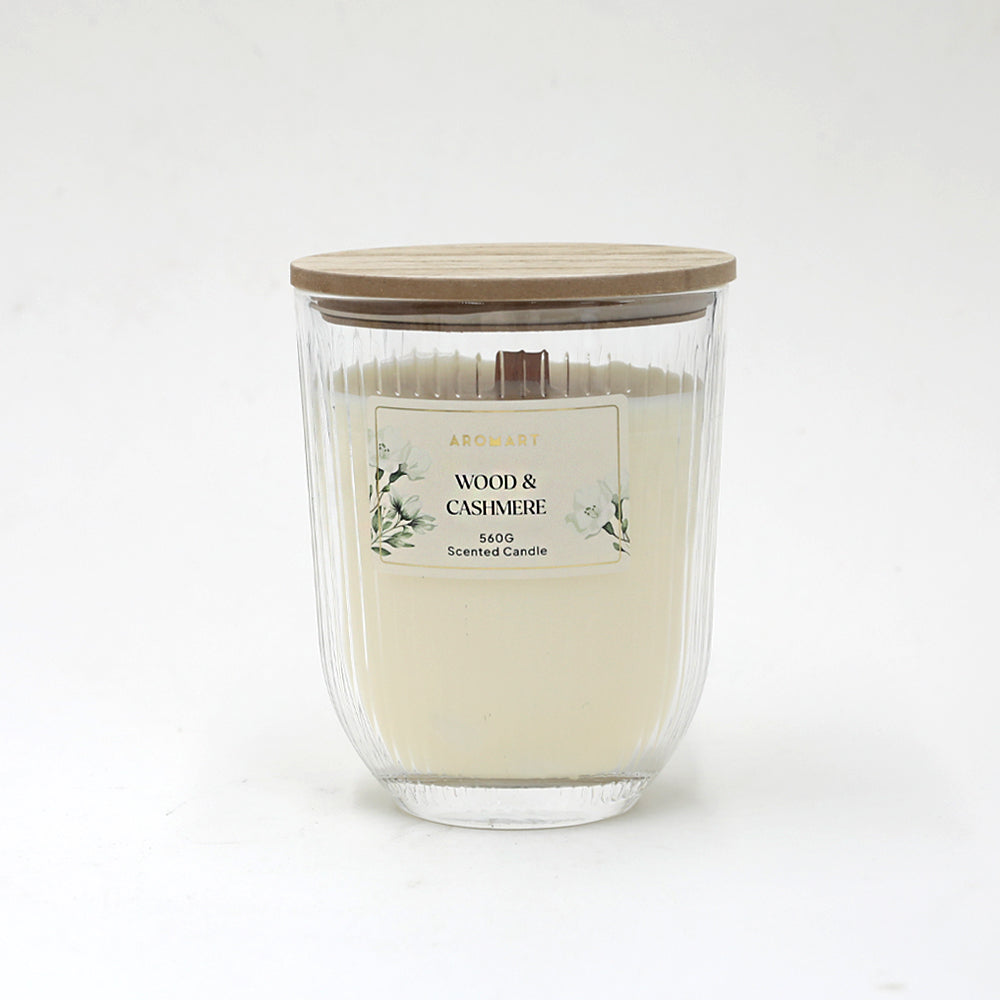 A luxurious large soy candle in a tall, elegant ribbed glass jar with a natural wooden lid. The 560g size provides an extended burn time, while the wooden wick creates a gentle crackling sound for the ultimate cosy atmosphere.